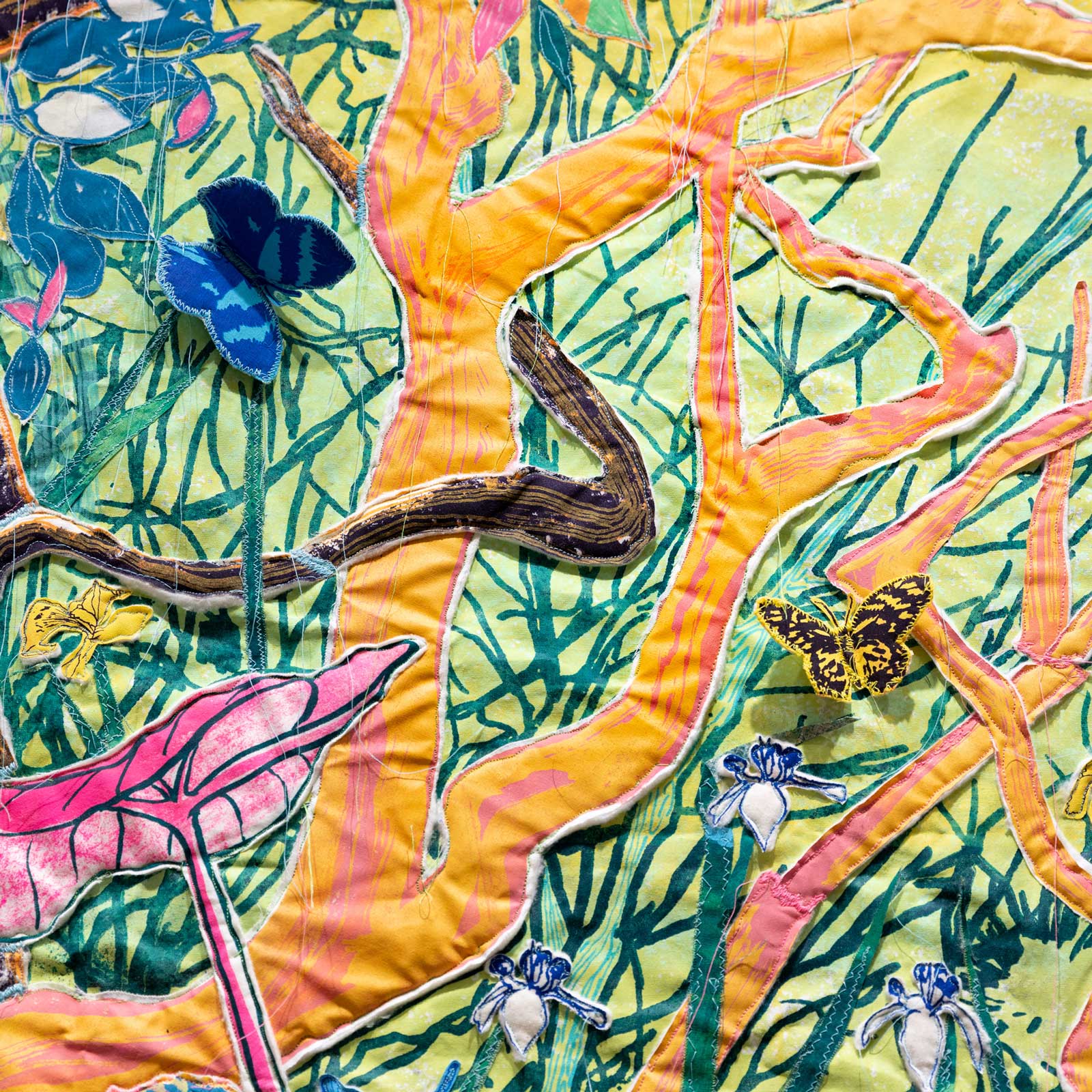 María used this opportunity to experiment with form in ways she had never attempted before. “I wanted to explore something that I haven't really connected into my practice yet, which was my very beginner level sewing skills,” she says. "I wanted to break away from this square format; I didn't want it to have a frame or really straight edges. I wanted it to be as organic as possible and almost three dimensional, and to be more multimedia by mixing fabric, collage, and quilting.” She also explains that using this technique allowed her to depict nature in a way that embraces its wildness. “I’m inspired by nature and nature is not symmetrical,” she says, “it's not stiff and it can be uncontrollable,” referencing the many loosely hanging threads, wavy canvas edges, and three-dimensional elements like colorful butterflies that seem as though they might fly right off of the tapestry.