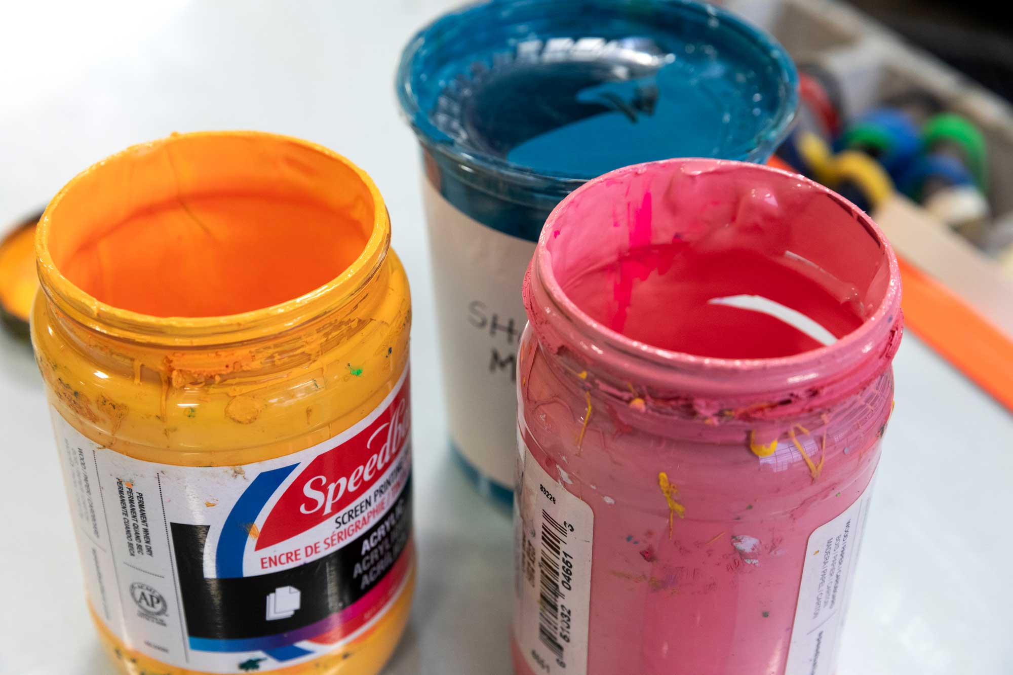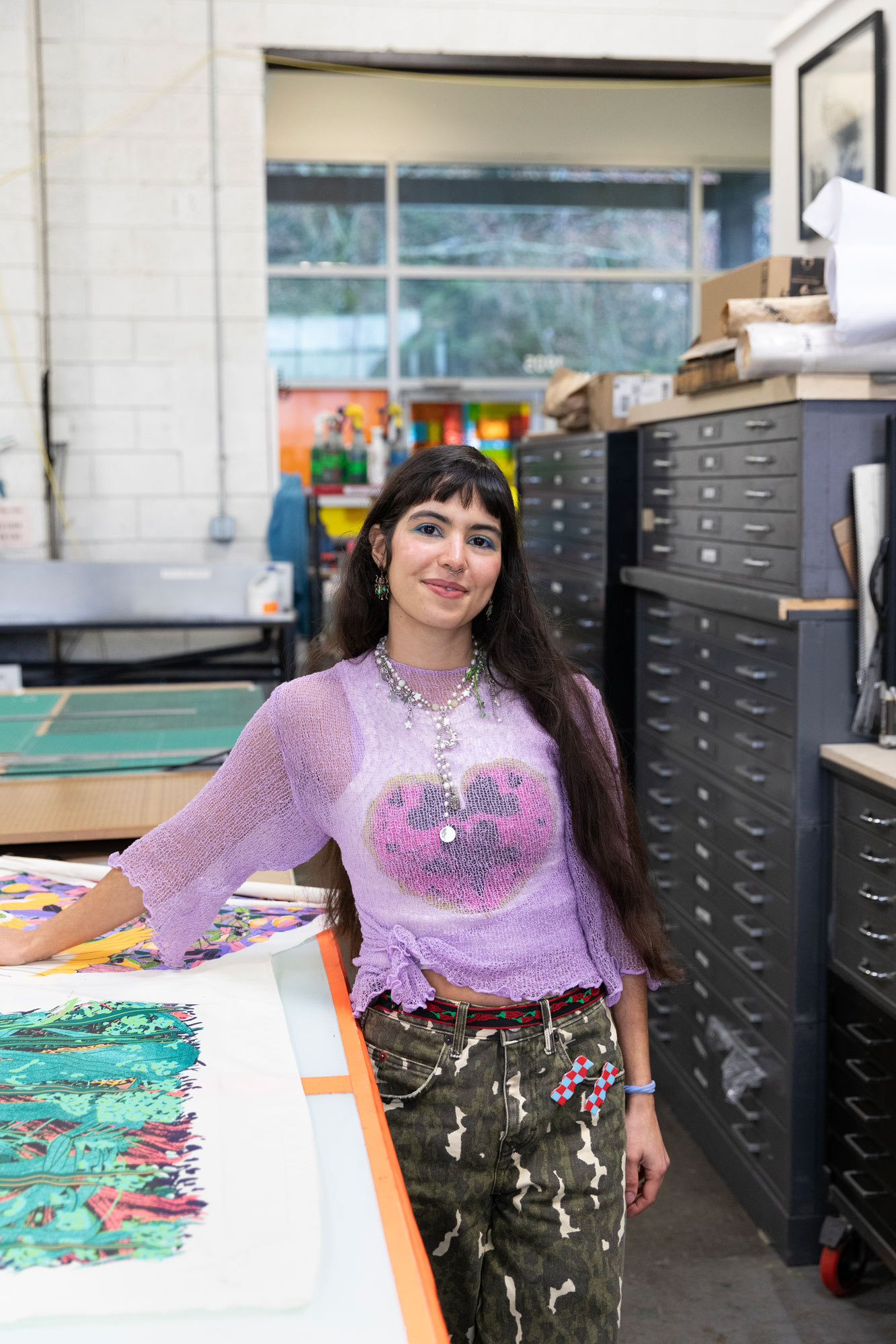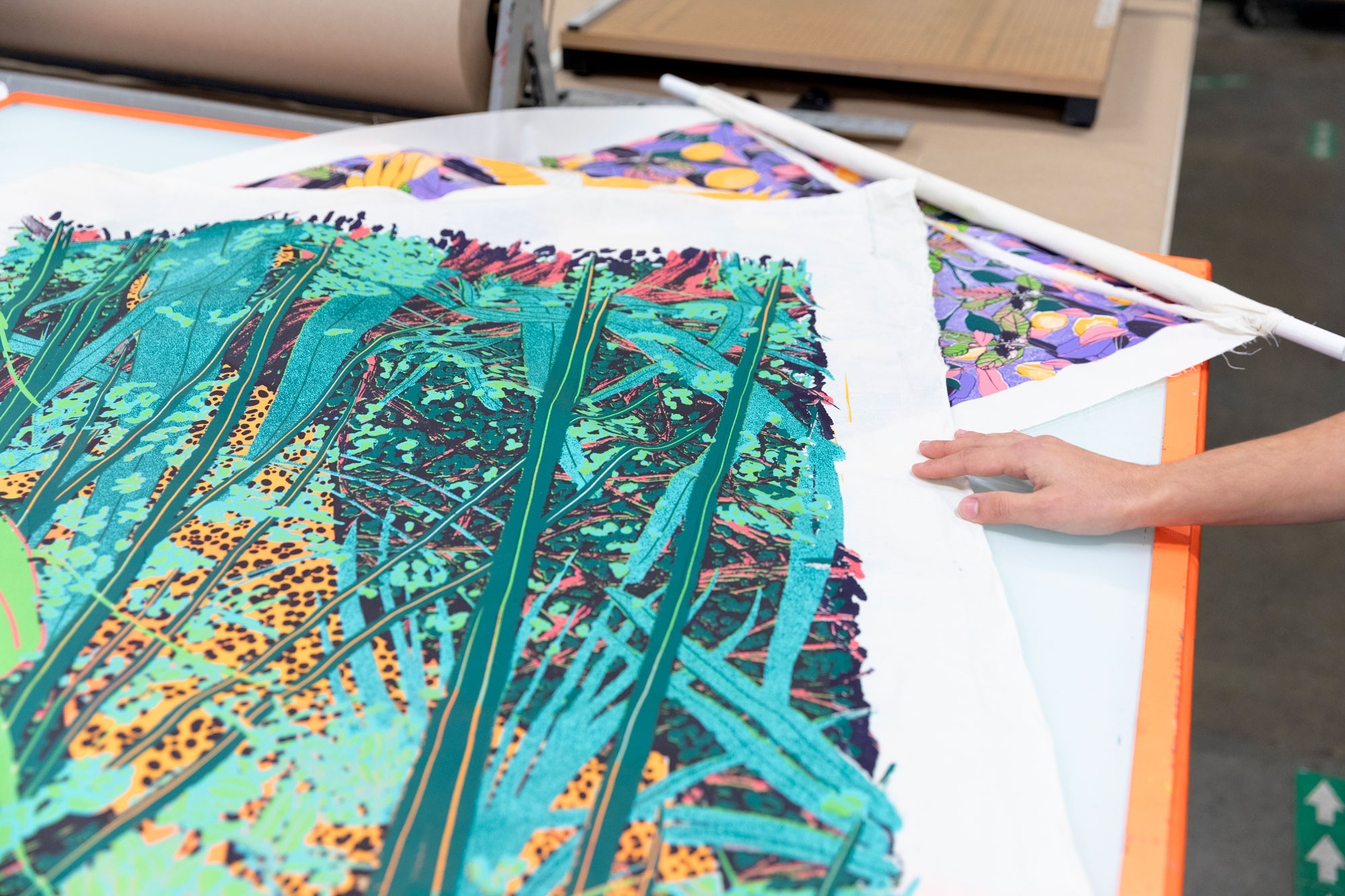 In a significant contrast to the exacting precision of her painting and drawing practices, María quickly embraced the fast pace and tricky nature of screenprinting. She explains how she is drawn to the “dance-like movements, physically demanding process, puzzling color layers, and problem-solving qualities of screenprinting,” and that “there will always be something new to fail at, learn from, and improve” in her work. She is energized by the intense preparation, color work, layering, and problem solving that printmaking demands. Since taking her first screenprinting class remotely during the 2020 lockdown, María has devoted the last five years of her studio time to creating screenprints in paper and fabric.