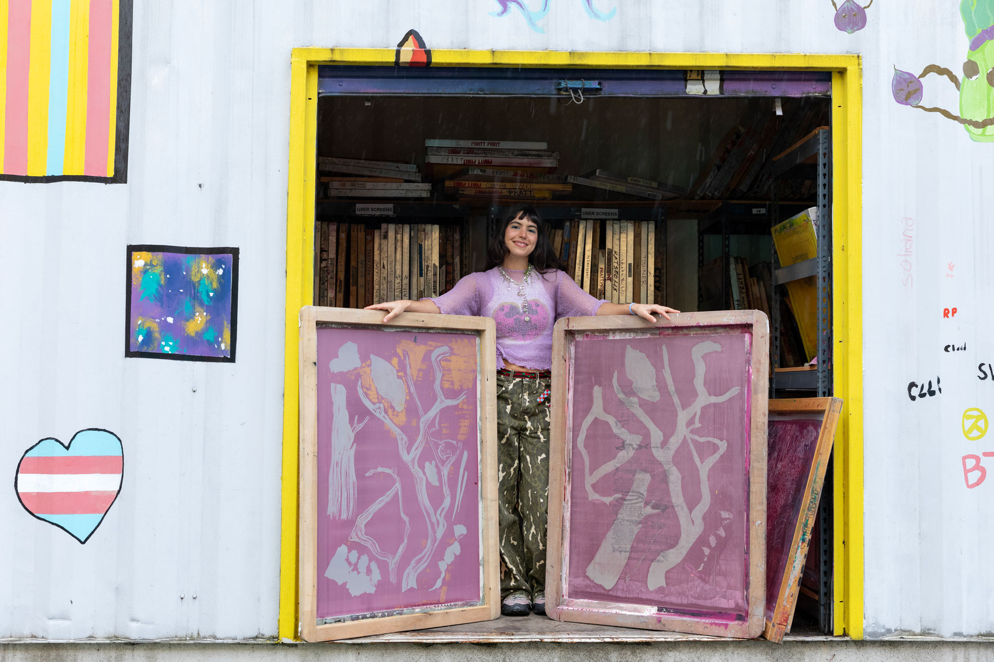 María Zamora is an interdisciplinary visual artist based in Seattle. Originally from Mérida, Venezuela, María’s work encapsulates an ever-evolving relationship to her home country from her unique vantage point in the diaspora. Her colorful pieces celebrate her heritage while also addressing complex topics such as migration and displacement. María spoke with Store Assistant Manager Caitlyn Edson for this piece—read on for more about her screenprinting practice, her Grandma Usha’s garden, and Los Cínaros, her original commission for the Frye Art Museum Store alcove.