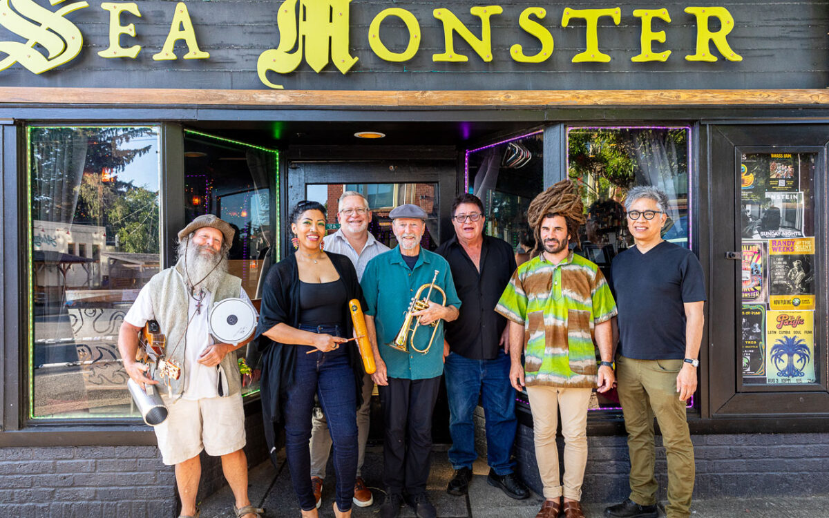 A diverse group of musicians posing outside a venue with a sign reading 'Sea Monster'