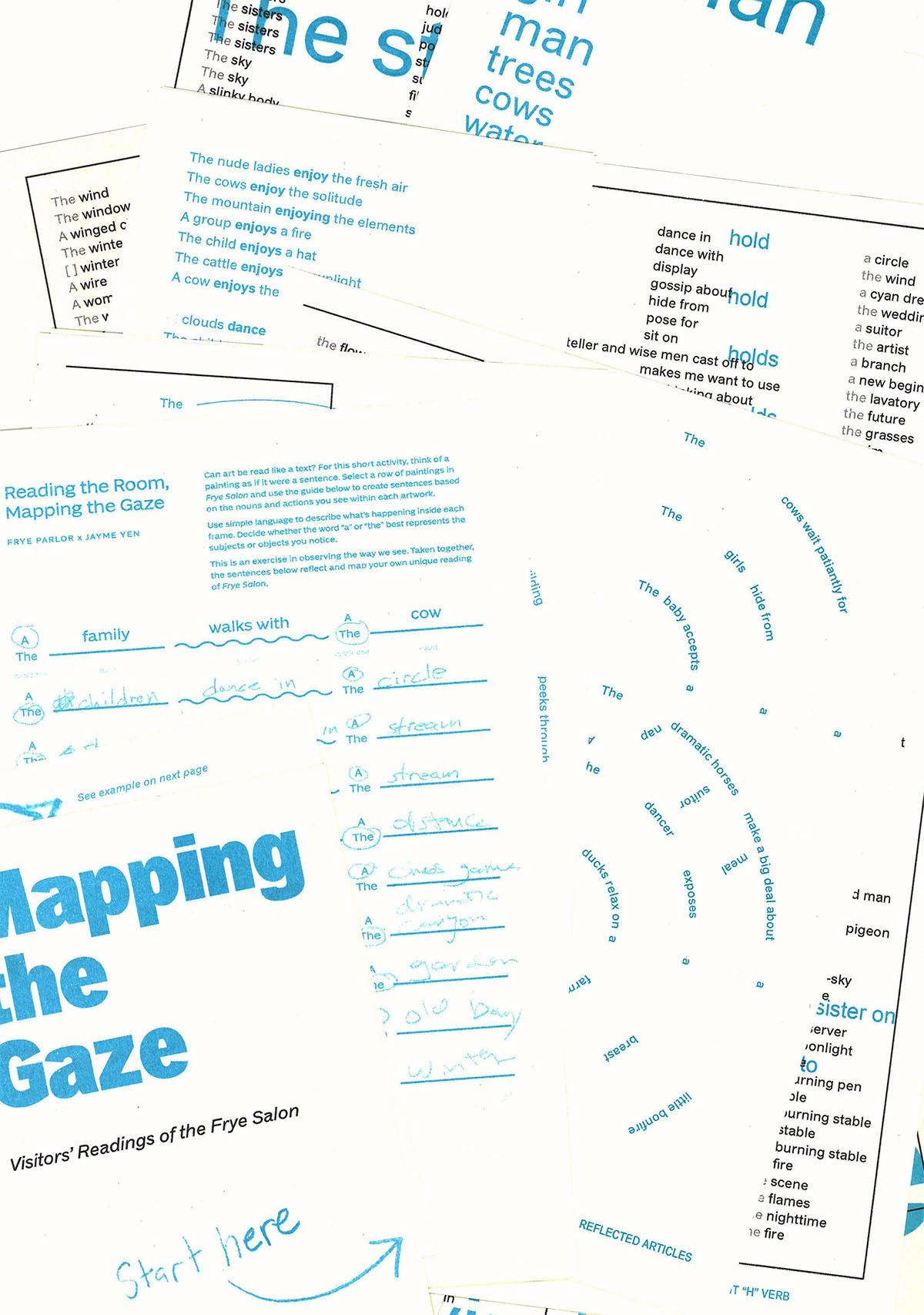 First artist Jayme Yen read the room, and designed a poster inspired by works in Frye Salon. Next, she designed the inaugural concept for Frye Parlor, translating the words from her design into an immersive environment. Then, she invited us to play along with an in-gallery activity called Reading the Room, Mapping the Gaze. Finally, along with Frye designer Lexi McCauley, she collected the worksheet submissions and translated the readings into the zine Mapping the Gaze: Visitor’s Readings of the Frye Salon. Starting February 26, the zine will be available for your reading pleasure in Frye Parlor x Jayme Yen.
