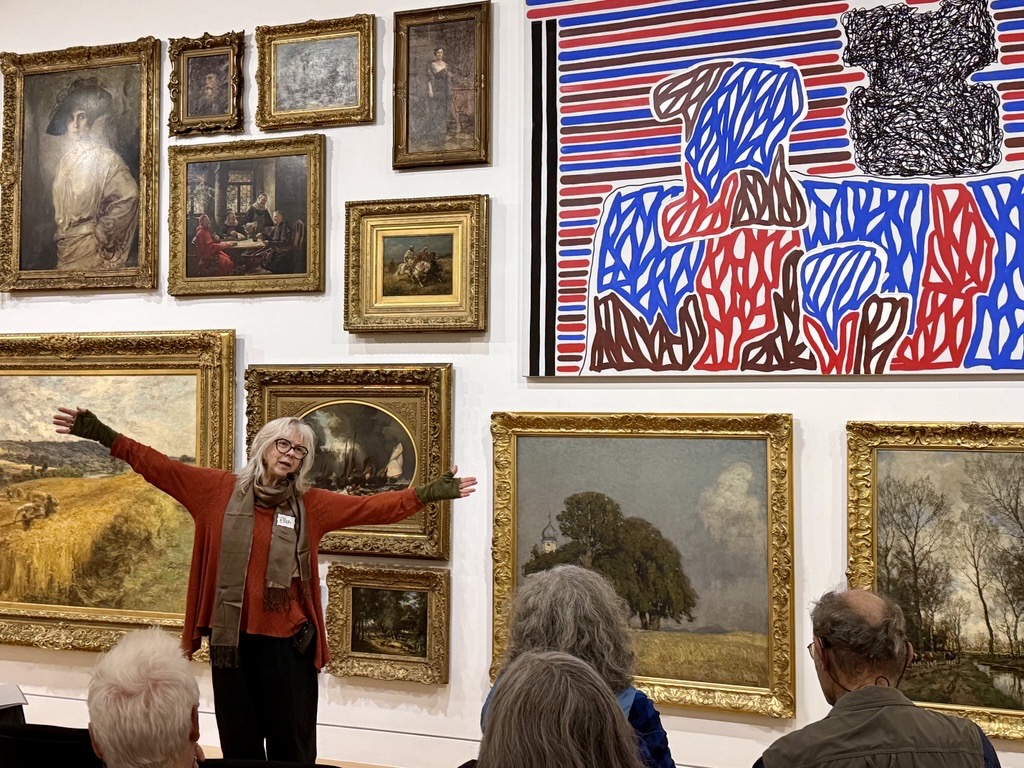 A person leading a class and standing in front of works of art extends their arms for emphasis.