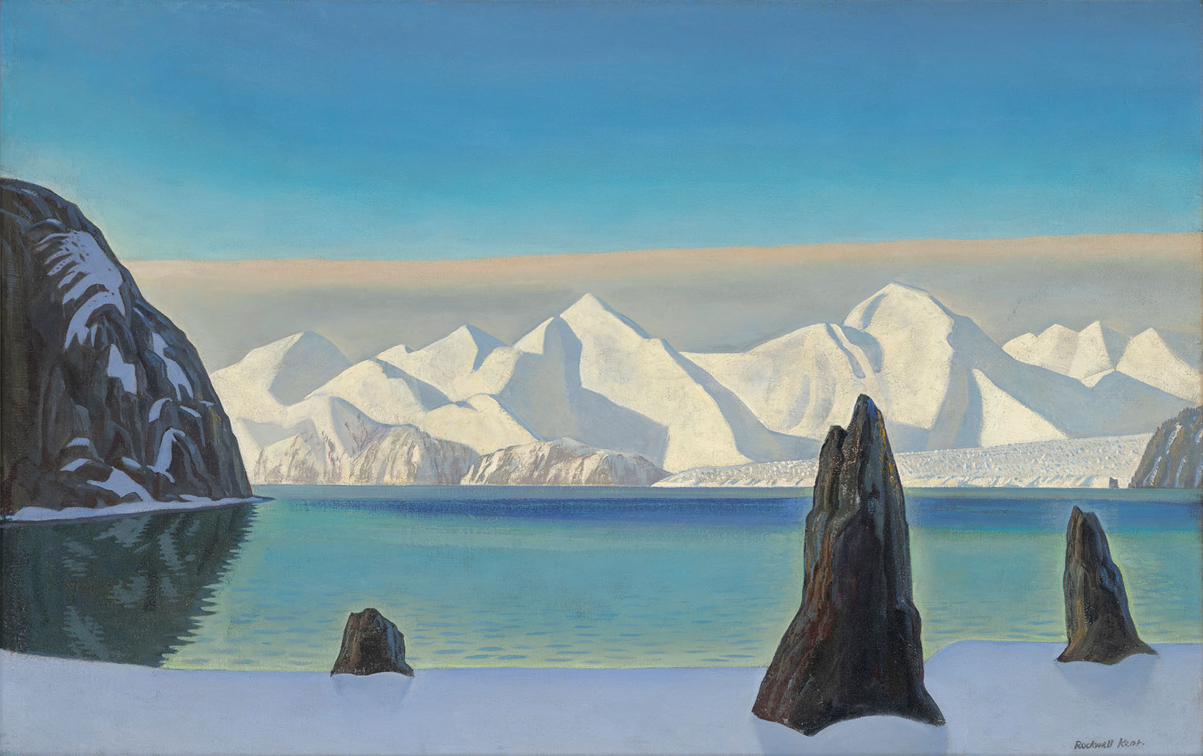 Rockwell Kent. Resurrection Bay from Fox Island, 1918/1966. Oil on canvas on board. 28 x 44 1/2 in. Frye Art Museum, Museum Purchase, 1998.010. Rights courtesy of Plattsburgh State Art Museum, State University of New York, USA, Rockwell Kent Collection, Bequest of Sally Kent Gorton. All rights reserved
