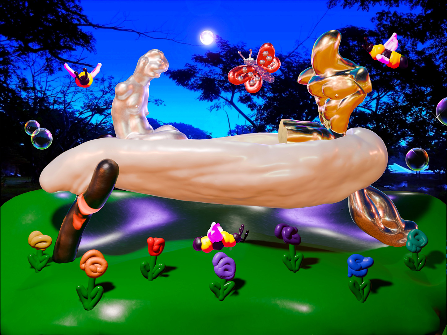 Classical mythology meets the digital age in Seattle artist Blake Blanco’s Boren Banner. Working first in a virtual reality studio, Blanco creates digital sketches that he then translates into paint on canvas. In this new work developed for the Frye, Blanco takes inspiration from the Italian Renaissance engraving Danae and the infant Perseus cast out to sea by Acrisius (1543). The artist expressively distills his subjects into simplified shapes whose vivid synthetic colors suggest a plastic, rather than organic, world. The project extends Blanco’s ongoing inquiry into what it means to be human in a moment when the boundaries between the natural and the manufactured are increasingly unstable.